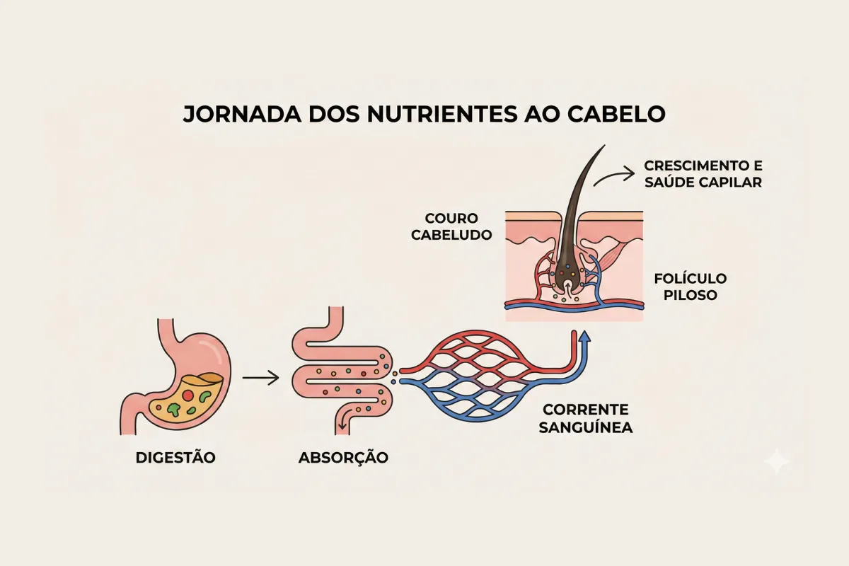 É aqui que entram os tónicos de alta absorção e, crucialmente, a suplementação capilar de alta potência. A verdadeira nutrição vem de dentro. O sangue é o “transportador” que leva o ferro, a biotina, o zinco e os aminoácidos até ao folículo. Se o seu sangue for pobre nestes nutrientes, ou se a microcirculação no couro cabeludo for fraca, o cabelo morre à fome.